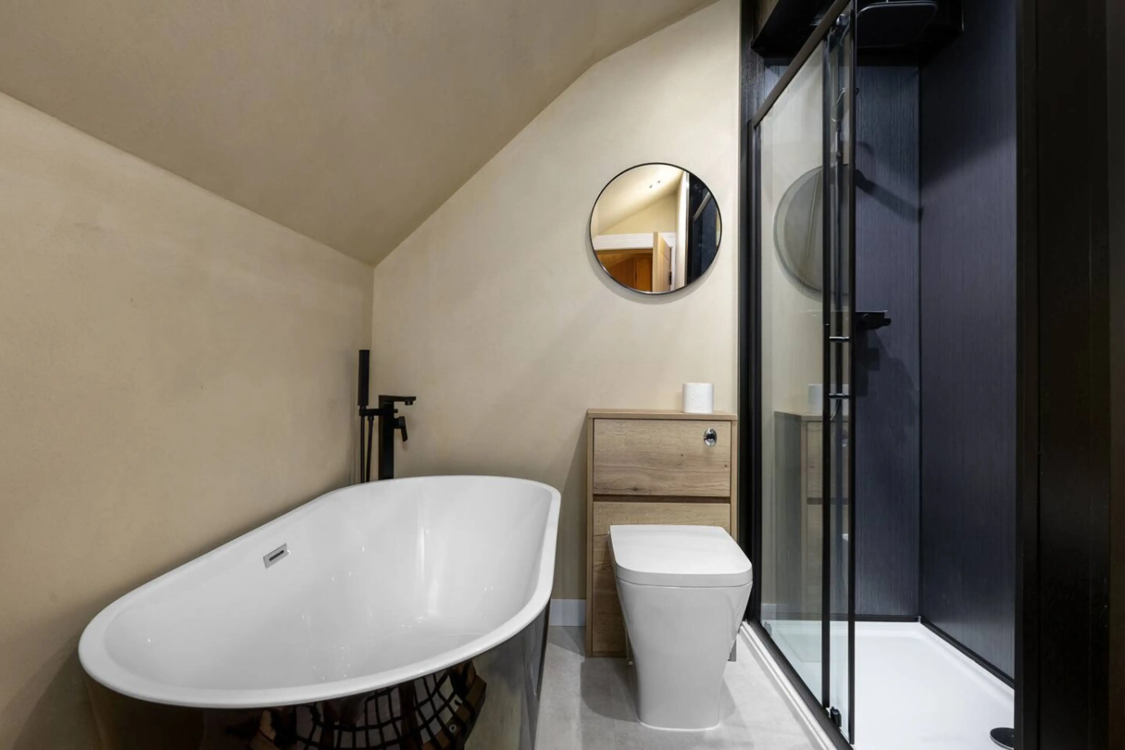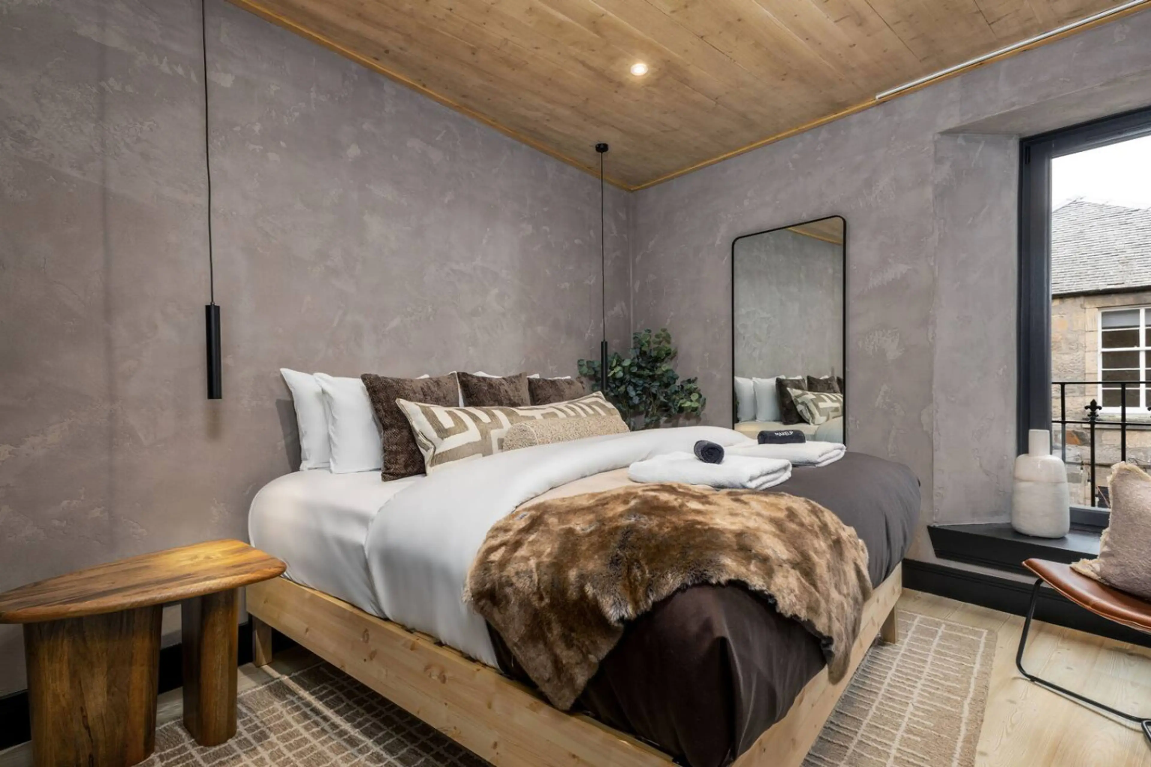 Discover Stirling Tranquility, a stylish Scottish-Scandi city centre apartment with a luxurious super king bed, stunning wooden ceilings, Venetian plaster walls & brushed concrete accents. This high-end retreat features a modern kitchen with Nespresso machine, cosy living area with 50" TV & a sleek ...